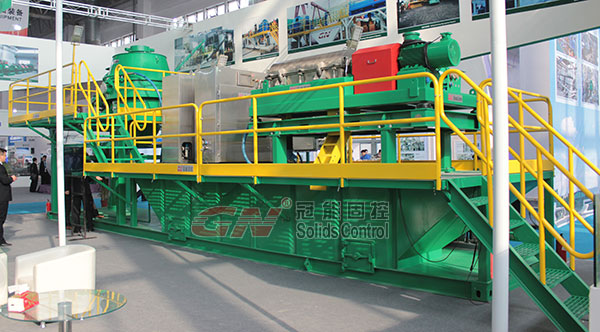 本屆石油展我們推出了一款鉆屑處理系統(tǒng)。該系統(tǒng)包括一個立式巖屑甩干機,一個高速離心機,雙螺桿泵和兩個正壓控制系統(tǒng)。該系統(tǒng)是綜合我們大量客戶的實際要求而設(shè)計的標(biāo)準(zhǔn)化鉆屑處理系統(tǒng),可以為客戶處理不同工況下的水基泥漿和油基泥漿。
