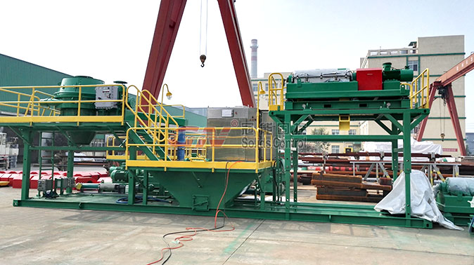 本套撬裝系統(tǒng)分為三個(gè)部分,撬裝兩端是用來安裝鉆屑甩干機(jī)單元和廢漿專用的沉降臥螺離心機(jī)單元。中間部分設(shè)有一個(gè)圓錐型泥漿罐,用來存儲(chǔ)從鉆屑干燥單元排放出的液相部分,甩干機(jī)及離心機(jī)的變頻控制部分安裝于錐形罐的上方,為控制設(shè)備及監(jiān)控設(shè)備運(yùn)行狀態(tài)提供了方便。