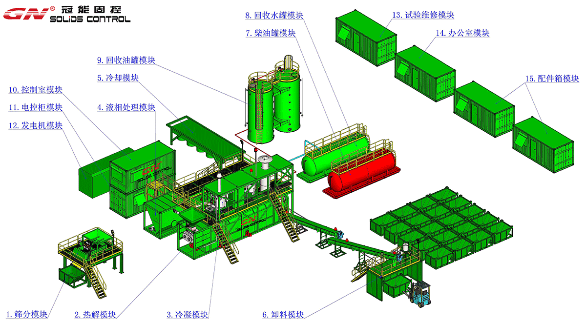 序號 名稱 數(shù)量 描述 選擇項 1 篩分模塊 1 進入熱解吸爐之前,對大顆粒物進行篩分 必選 2 熱解吸模塊 1 包含6個燃燒機,對物料進行間接加熱熱解成蒸氣 必選 3 冷凝模塊 1 對蒸氣進行除塵冷凝成油水固混合物 必選 4 液相處理模塊 1 對油水固三相進行分離處理 必選 5 冷卻模塊 1 對冷凝模塊來的熱水進行循環(huán)冷卻處理 必選 6 卸料模塊 1 包括卸料冷卻螺旋,卸料噴淋系統(tǒng) 必選 7 柴油罐模塊 1 用于儲存給燃燒機的燃油,并給燃燒機供油 必選 8 回收水罐模塊 1 用于儲存回收到的水 可選 9 回收油罐模塊 2 用于儲存回收到的油 可選 10 控制室模塊 1 操作人員在控制室對系統(tǒng)進行監(jiān)控操作 必選 11 電控室模塊 1 用于變頻器和電控柜安裝 必選 12 發(fā)電機模塊 1 用于給整個系統(tǒng)提供電力 可選 13 試驗維修模塊 1 用于樣品測試和設(shè)備維修 可選 14 辦公室模塊 1 經(jīng)理和工作人員辦公 可選 15 配件箱模塊 2 一個用于儲存電氣配件,一個用于儲存機械配件 可選 備注說明:以上選擇項,注明可選的表示用戶可以從冠能公司購買或自行準(zhǔn)備或者,注明必選項的必須從冠能公司購買,否則無法滿足整個系統(tǒng)匹配工作。通常冠能公司的熱解吸系統(tǒng)的報價指包含必選項目,可選項目需要額外報價。